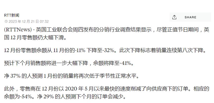 一份來自英國工業聯合會(Federation of British Industry)的調查報告顯示,去年下半年,即使是黑五、網一、圣誕節等一系列重量級大促,都沒能點燃英國消費者的購物熱情。數據顯示,去年11月,英國零售額同比下降了11%,12月零售額繼續同比下降32%。按照這樣的趨勢,今年1月英國零售額預計同比下降41%。