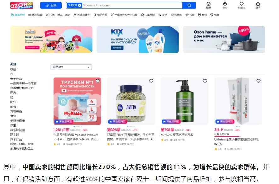 值得注意的是,中國市場(chǎng)在Ozon的增長中扮演了舉足輕重的角色。在2023年11月9日到11月11日為期三天的年底大促期間,Ozon平臺(tái)總銷售額高達(dá)300億盧布,其中中國賣家的銷售額同比暴漲270%,占大促總銷售額的11%,成為平臺(tái)上增長最快的賣家群體。