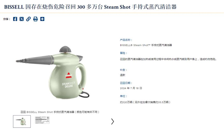 今年7月底,BISSELL旗下一款蒸汽清潔器被CPSC點名召回。據悉,這款產品在亞馬遜、沃爾瑪、Target等多個平臺上出售,售價在35—40美元,截止到今年5月已經售出了總共320萬件。之所以會被召回,是因為該產品存在漏出熱水或蒸汽的問題,已經導致了183起事故,致使多名消費者在使用過程中受傷。