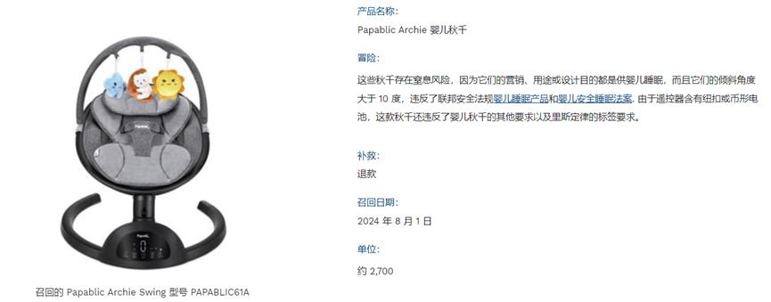 近日,據媒體報道,美國消費品安全委員會(CPSC)宣布緊急召回Papablic Archie旗下一款型號為PAPABLIC61A的嬰兒秋千,理由是存在安全隱患。