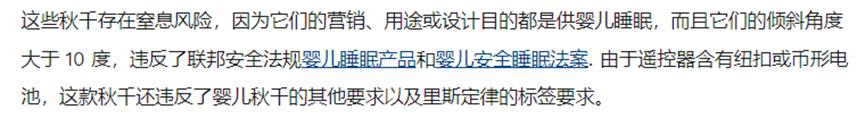 對于這款產品被召回的原因,CPSC做了詳細敘述。首先,這款產品的主要用途是供嬰兒睡眠,但它的傾斜角度大于10度,可能會導致嬰兒窒息,違反了聯邦安全法規嬰兒睡眠產品和嬰兒安全睡眠法案。其次,這款產品配備的遙控器中含有紐扣電池,違反了有關嬰兒秋千的其他一些安全要求。