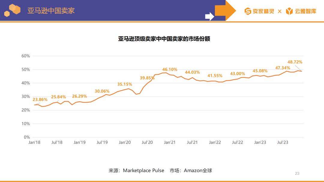 根據Marketplace Pulse數據,近年來,中國賣家在亞馬遜上的市場份額節節攀升,截至2023年,亞馬遜上近半數的頂級第三方賣家都來自中國。