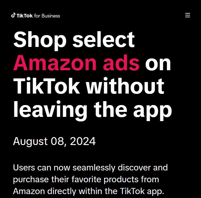 TikTok公告顯示,用戶現(xiàn)在可以在TikTok應(yīng)用中無縫發(fā)現(xiàn)和購買他們喜歡的亞馬遜產(chǎn)品,這種購物體驗由亞馬遜通過TikTok上的廣告提供支持,并允許用戶在TikTok的原生環(huán)境中通過亞馬遜完成產(chǎn)品購買。