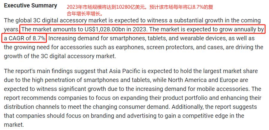 分析機構Digital Journal此前就發布過一份報告,其中指出,3C數碼配件市場正在釋放出持續增長的積極信號,預計全球市場規模在2023年能達到1.02萬億美元左右。而隨著3C數碼配件種類的日益豐富,從從保護產品安全的手機殼、鋼化膜,到提升使用體驗的耳機、充電寶,再到滿足專業需求的攝影配件、音頻設備等,賣家們能夠選擇的細分類目相當多,機會也更多。