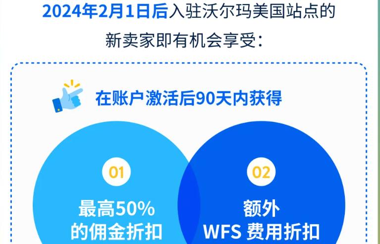 為了進一步降低賣家的入駐成本,沃爾瑪還推出了一系列優惠政策。今年2月份,沃爾瑪在新賣家激勵計劃中明確表示2024年2月1日之后入駐沃爾瑪美國站點的新賣家有機會享受超值優惠大禮包,即在賬戶激活后90天內獲得最高50%的傭金折扣,還有額外的WFS費用折扣。