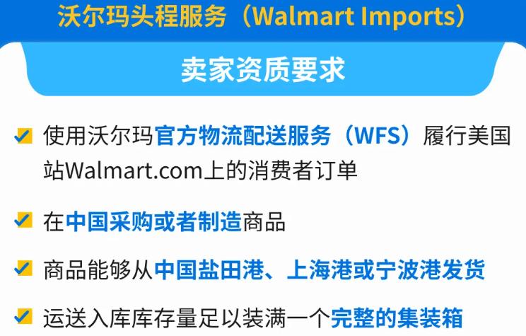 值得一提的是,加入沃爾瑪頭程服務也對賣家資質做出了一定的要求。具體來說,賣家需要滿足使用沃爾瑪官方物流配送服務(WFS)履行美國站Walmart.com上的消費者訂單、在中國采購或者制造商品、商品能夠從中國鹽田港/上海港或寧波港發貨、運送入庫庫存量足以裝滿一個完整的集裝箱這四個條件。