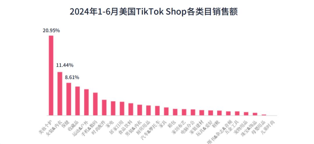 在美妝市場最為成熟的美國,TikTok的影響力更是非同凡響。根據FastMoss最新發布的《2024年半年度TikTok生態發展白皮書》,2024年上半年,美妝個護品類穩居TikTok美區第一大熱門品類,占據平臺商品銷售總額的20.95%,遙遙領先排名第二的女裝及內衣品類(11.44%)。