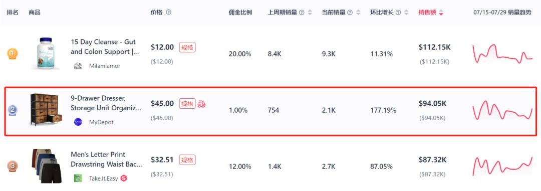 7月30日一天,這款收納柜的銷量就達(dá)到了2100件,直接促成銷售額達(dá)9.4萬(wàn)美金,并成功沖上當(dāng)日銷量榜第二。如果按照店內(nèi)45美元的售價(jià)估算,單單這款收納柜就能為小店帶來(lái)單月172萬(wàn)美元的銷售業(yè)績(jī)。