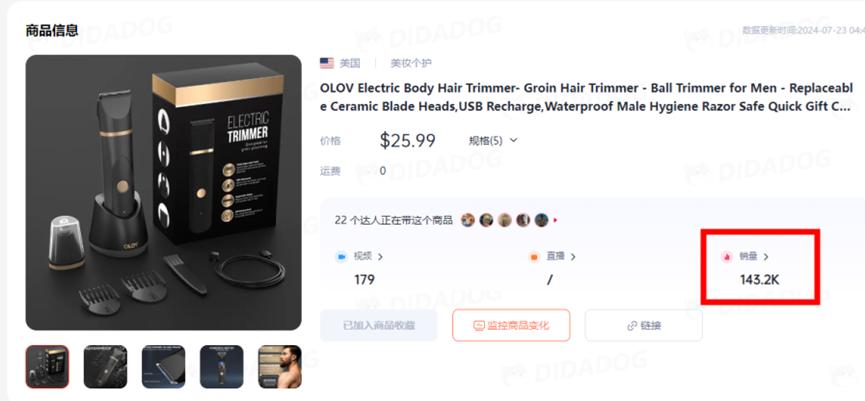再比如個(gè)護(hù)品牌OLOV,該品牌另辟蹊徑,瞄準(zhǔn)了相對小眾的男性個(gè)人護(hù)理市場,打造出了一款男性體毛修剪刀。該產(chǎn)品質(zhì)量過硬,又憑借社媒營銷大大提升了知名度,因而近段時(shí)間以來銷量飛漲。didadog提供的數(shù)據(jù)顯示,近30天該產(chǎn)品售出了3.8萬件,近半年來的總銷售額更是達(dá)到了驚人的300萬美元。