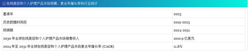 一份來自Cognitive Market Research的研究指出,包括皮膚護(hù)理、頭發(fā)護(hù)理、彩妝、香水、口腔衛(wèi)生產(chǎn)品、沐浴和淋浴產(chǎn)品、男用化妝品等細(xì)分領(lǐng)域在內(nèi)的全球美妝個(gè)護(hù)在線市場,正在以驚人的速度增長著。數(shù)據(jù)顯示,2024—2031年期間,全球美妝個(gè)護(hù)在線市場的復(fù)合年增長率預(yù)計(jì)將為11.8%。到了2031年時(shí),這一市場的規(guī)模會(huì)增長到驚人的1010.9億美元。
