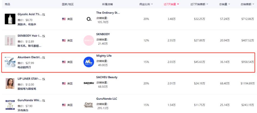 就比方說主營女性個(gè)護(hù)產(chǎn)品的Mighty Life,該小店瞄準(zhǔn)女性剃須產(chǎn)品方面的空白,推出了一款A(yù)kunbem女士電動(dòng)剃須刀,并成功在TikTok上走紅。根據(jù)FastMoss提供的數(shù)據(jù),這款女士電動(dòng)剃須刀售價(jià)為27.99美元,近7天在TikTok Shop的銷量高達(dá)2.03萬,銷售額高達(dá)45.63萬美元。截止目前,這款爆品的總銷量已經(jīng)突破了36萬,總銷售額將近960萬美金。