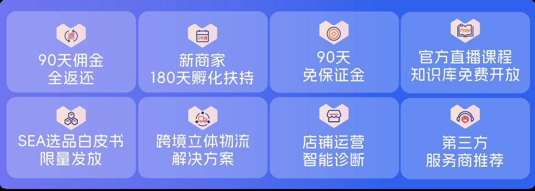 為了給平臺注入新鮮活力, Lazada 2024年新賣家激勵政策再增一項強有力的新商入駐權益。截至目前,包含90天免保證金之內,共有八項新商激勵政策,包括90天傭金全返還、新商180天扶持計劃、官方直播課程知識庫免費開放、SEA選品白皮書限量發放、跨境立體物流解決方案、店鋪運營智能診斷、第三方服務商推薦。