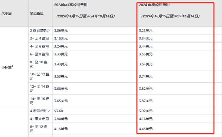 亞馬遜2024年旺季配送費率更新 圖源:亞馬遜