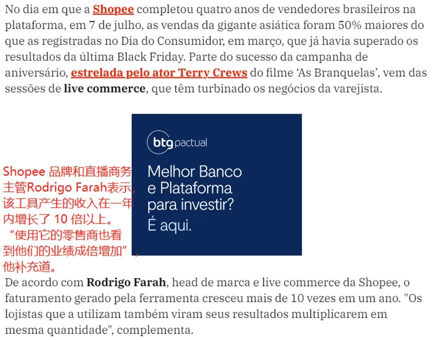 日前,Shopee巴西站品牌和直播商務主管Rodrigo Farah表示,過去一年,Shopee巴西站通過直播電商業務達成的收入增長了超過10倍,直播電商賣家們的業績也在瘋狂上漲。