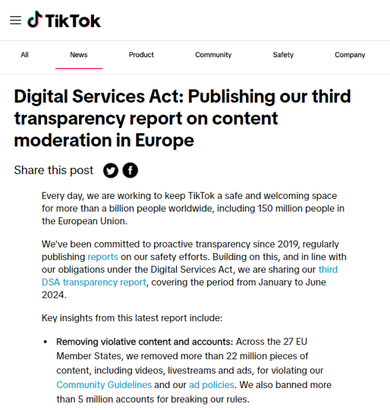 10月25日消息,TikTok日前公布了其最新的歐盟用戶和內(nèi)容審核數(shù)據(jù),作為其基于歐盟DSA法案披露義務(wù)的一部分。最新報告涵蓋了今年1月至6月之間的數(shù)據(jù),是TikTok第一份涵蓋整個六個月時間段的報告。TikTok之前已經(jīng)發(fā)布過兩份DSA報告,一份涵蓋單個月度數(shù)據(jù),另一份涵蓋截至去年的三個月數(shù)據(jù)。數(shù)據(jù)顯示,TikTok目前在歐盟擁有1.505億月活躍用戶。與上一份報告相比,TikTok的用戶數(shù)量增加了800萬。