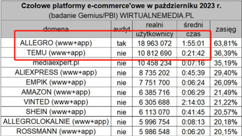 Temu與Allegro的差距減少到72萬 圖源:Mediapanel