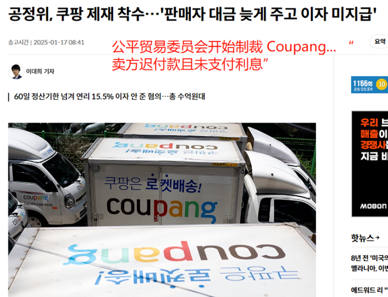Coupang因涉嫌拖欠賣家付款而面臨制裁 圖源:yna.co.kr