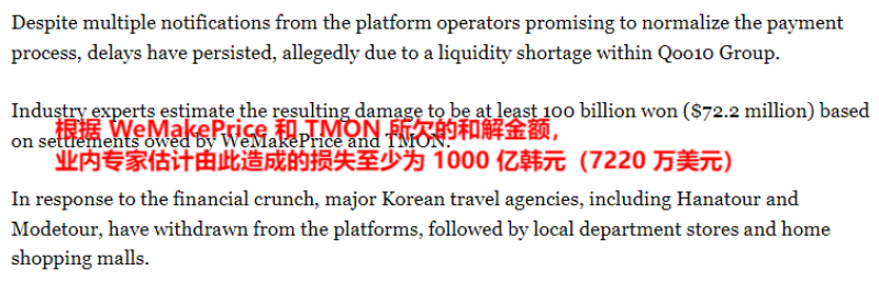 例如在去年7月,韓國第四大和第五大電商平臺TMON和WeMakePrice就曾陷入嚴重的財務困境,當時這兩大巨頭累計拖欠賣家貨款超過1000億韓元(約合7220萬美元),甚至不少賣家連當年5月份的貨款都沒有收到。