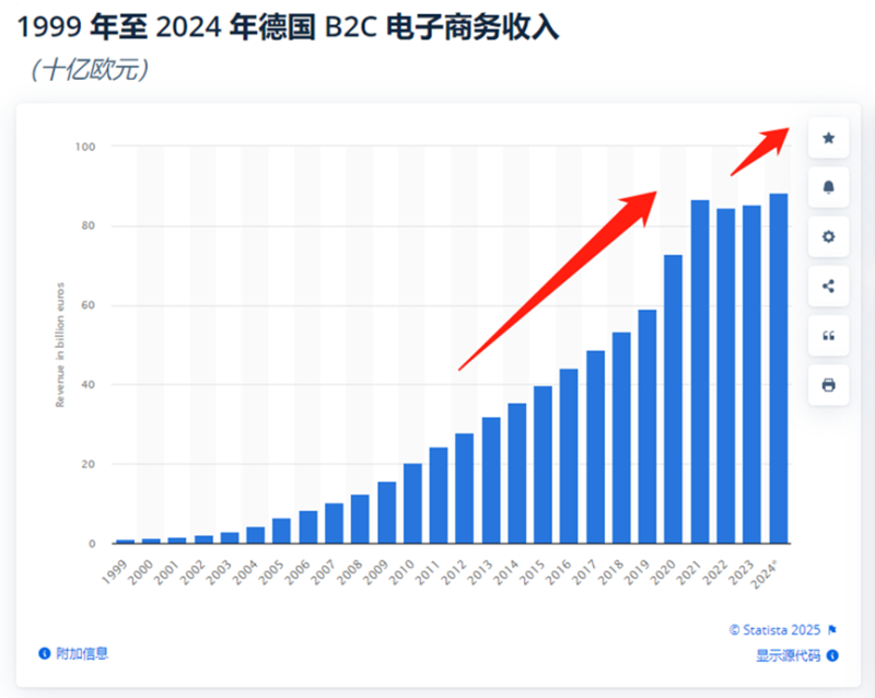 根據(jù)德國聯(lián)邦電子商務(wù)和運輸協(xié)會bevh提供的數(shù)據(jù),德國電商市場在經(jīng)歷了兩年的下滑之后,終于在2024年重新實現(xiàn)了1.1%增長,在線支出總額為806億歐元。而根據(jù)Statista的數(shù)據(jù),2024年德國B2C電商行業(yè)收入預(yù)估增長了29億歐元,達(dá)到了883億歐元。并且在未來,德國電商市場預(yù)計會持續(xù)增長。