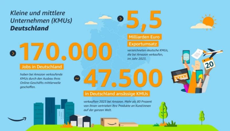目前在德國電商市場,亞馬遜占據(jù)著主導(dǎo)地位,是當(dāng)之無愧的領(lǐng)軍企業(yè),超過了Otto、Zalando等一眾歐洲本土電商巨頭。另外值得一提的是,亞馬遜在德國市場的發(fā)展,也帶動了當(dāng)?shù)刂行∑髽I(yè)生意的增長。根據(jù)官方公布的數(shù)據(jù),2023年德國中小企業(yè)在亞馬遜上的出口銷售額同比增長10%至55億歐元,創(chuàng)下了歷史新高。