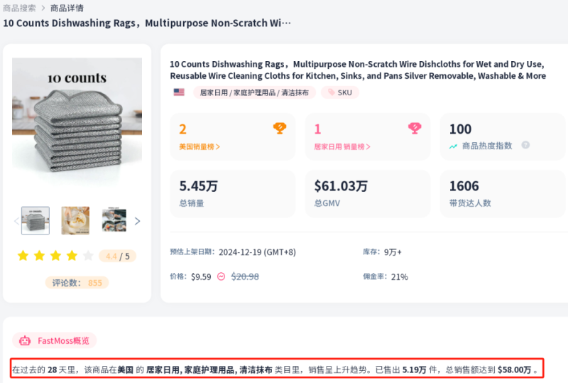 據FastMoss數據顯示,一款名為“10 Counts Dishwashing Rags”的廚房抹布,近期銷量迅速攀升,在最近的一個月時間里已經賣出5.19萬件,帶來累計58萬美金的銷售額。這款多功能、耐用且環保的廚房清潔用品在美國市場的TikTok平臺上大放異彩,一舉沖上新品熱銷榜首位。