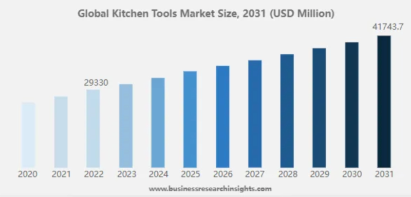 需求的持續上漲帶動著行業直接起飛,廚房用品的全球市場規模在近些年呈現出了強勁增長的態勢。來自Business Research Insights發布的數據顯示,全球廚房工具市場規模在2022年時就已經達到了293.3億美元,這一數字到2031年將飆升至417.437億美元,預測期內復合年增長率為4%。這一趨勢不僅體現在發達國家市場,新興市場同樣展現出強勁的增長潛力。