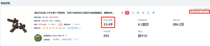 近日,一款木制十字架裝飾品突然走紅,該商品來自Love U Gift 店鋪,于去年12月底正式上線美區,截至目前已經售出了3.34萬單,而在過去的28天內,該款木制十字架裝飾品也賣出約8000單,銷量十分穩定。