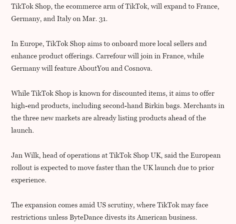 3月28日消息,TikTok Shop將于3月31日正式在法國、德國和意大利上線,進一步擴大其在歐洲的業(yè)務(wù)版圖。目前,TikTok Shop正在與歐洲本地賣家合作,以推動平臺商品供應(yīng)的多元化。在此次擴張中,法國的家樂福、德國的在線時尚零售商About You及化妝品牌Cosnova均已確認入駐TikTok Shop,標志著該平臺在歐洲市場的進一步滲透。
