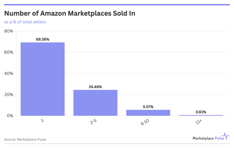 3月30日消息,Marketplace Pulse最新發布的研究顯示,69%的亞馬遜賣家仍僅活躍在單一市場,僅6%的賣家拓展至六個或更多市場,而真正覆蓋11個以上市場的全球化賣家不到1%。盡管亞馬遜已開設23個活躍市場,并提供全球銷售賬戶、定價策略、供應鏈管理和貨幣轉換等支持工具,但賣家對國際擴張仍持謹慎態度。