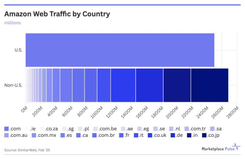 賣家對跨境擴張的猶豫主要源于監管復雜性和市場規模差異。亞馬遜建立的零售基礎設施理論上簡化了國際銷售,但文化、監管和物流的現實意味著大多數賣家仍更傾向于留在熟悉的領域。市場規模懸殊也成為重要阻礙,Similar Web數據顯示,亞馬遜美國站的流量僅略低于其他22個市場流量總和。當賣家將潛在回報與擴張所需的努力進行比較時,許多人得出的結論是,僅美國市場就提供了足夠的機會。