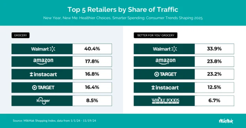 另一家巨頭沃爾瑪也不甘示弱,其借助TikTok的直播功能將雜貨產品線上銷售給更多年輕群體。MikMak最新發布的購物指數顯示,在排名前五的在線雜貨零售商中,沃爾瑪以40.4%的流量份額遙遙領先,穩居市場第一。