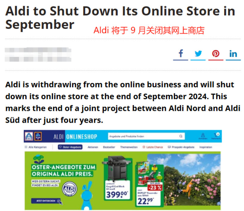 近日,德國折扣零售商Aldi Nord和Aldi Süd宣布將于今年9月底關閉其網上商店,在此之前客戶仍可下單,這標志著這兩家零售商僅四年的合作項目就此結束。目前Aldi未透露受影響員工的具體人數,但有消息稱約有80名員工會受到影響。
