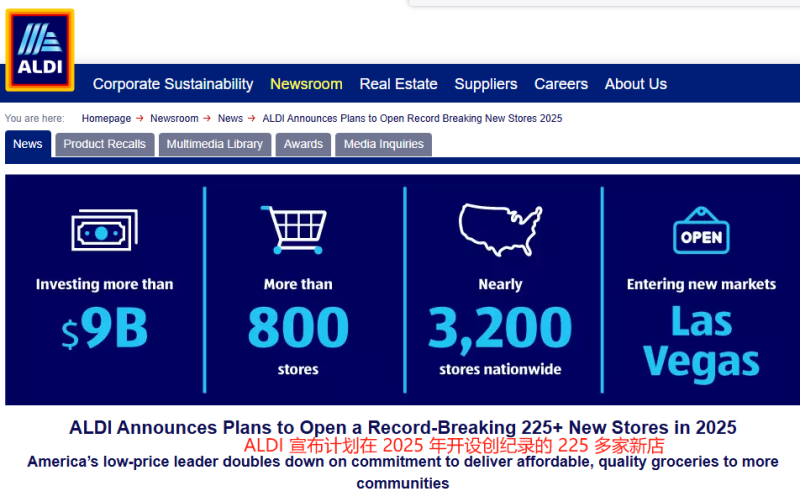 線下零售業務強勁發展,Aldi擴張步伐越邁越大。今年2月,Aldi宣布將于2025年在美國開設超過225家新店,這是其近50年歷史上一年內開設門店最多的一次。