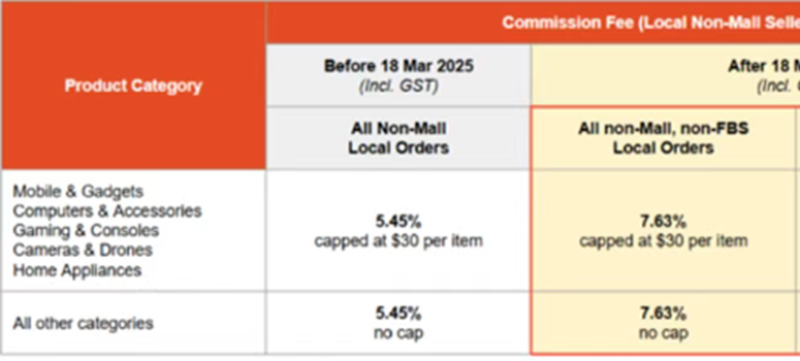 今年2月,Shopee新加坡本土店就發(fā)布消息稱,將對(duì)該站點(diǎn)傭金費(fèi)率和其他相關(guān)費(fèi)率做出調(diào)整。自2025年3月18起,所有非商城訂單和非本地訂單的傭金費(fèi)率將從5.45%上調(diào)至7.63%,不過本地FBS(Fulfillment by Seller)非商城賣家可以享受4.36%最低基本傭金費(fèi)用的優(yōu)惠政策。