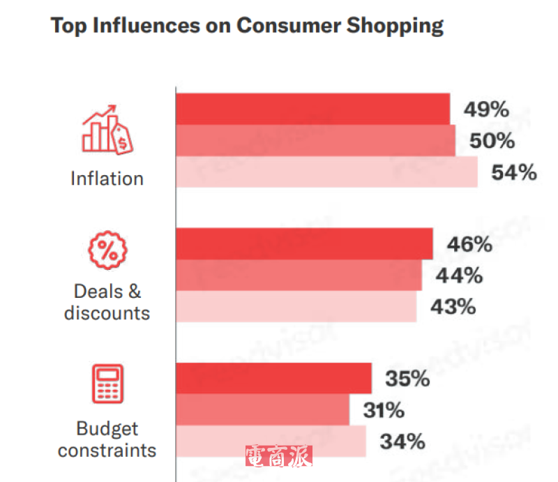 Feedvisor發布的《2025年美國電商消費者行為報告》則表示,2024年通貨膨脹主導著美國消費者情緒,也影響著他們的預算、購物和支出方式。其中有49%消費者將通貨膨脹列為影響其購買決策的首要因素,甚至高于促銷折扣和預算限制。
