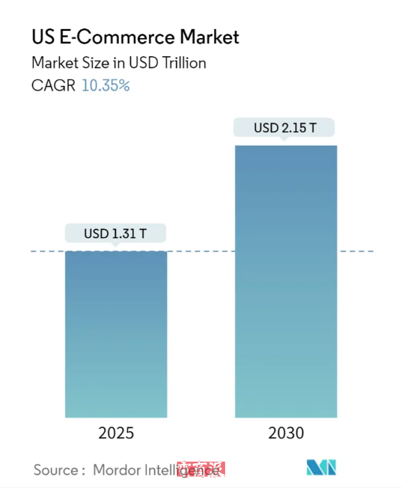 Mordor Intelligence 數據顯示,2025年美國電商市場規模預計為1.31 萬億美元,預計2025年至2030年的復合年增長率為10.35%,2030年市場規模有望達到2.15萬億美元。