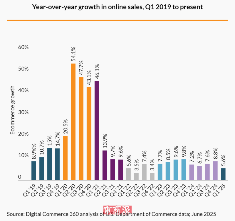 近日,根據Digital Commerce 360對美國商務部數據的分析,美國電商銷售在2025年第一季度同比增長6.1%,但這也是兩年多來的最低水平,結束了電商銷售額連續近兩年增速至少為整體零售增速兩倍的態勢。