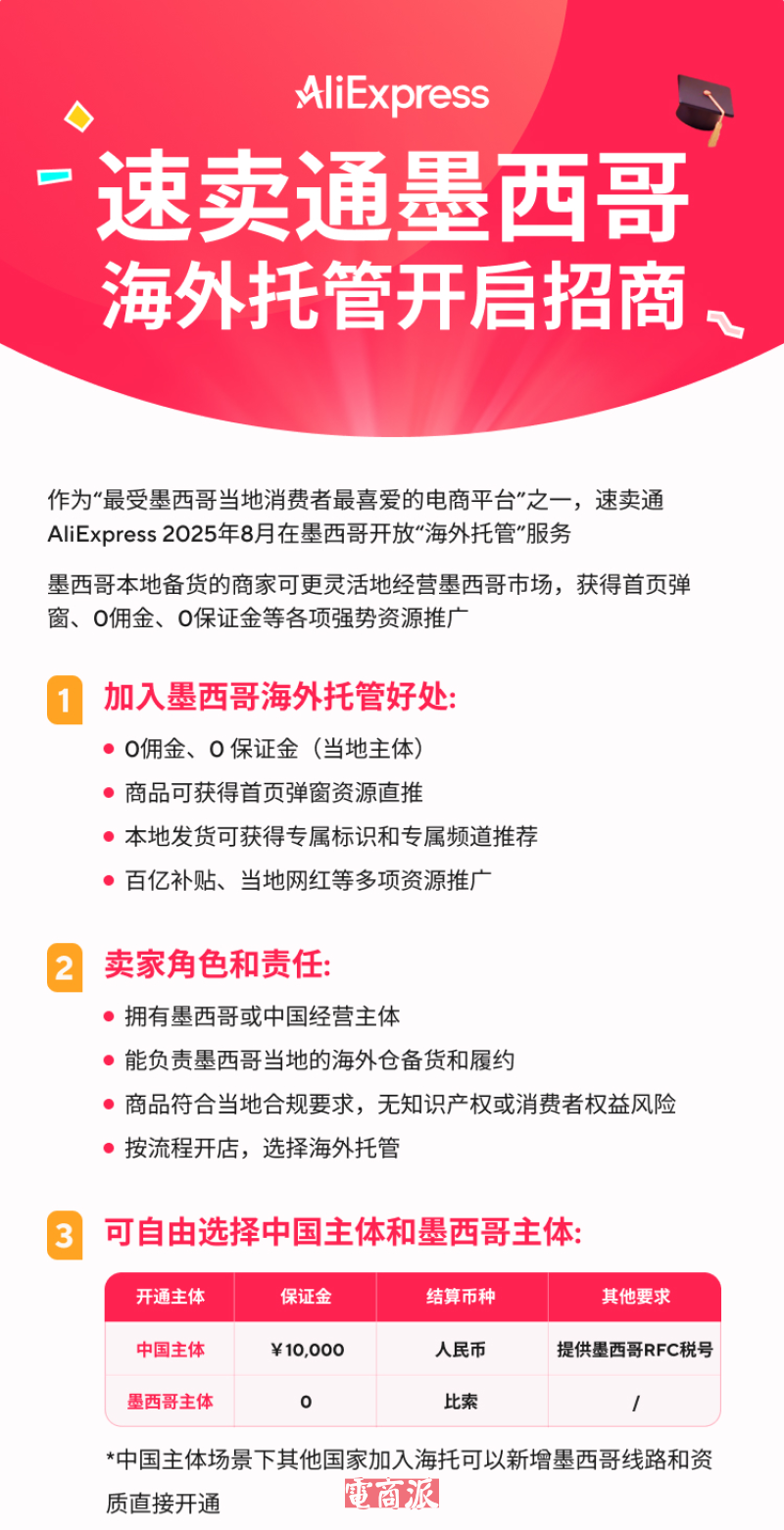 8月14日消息,速賣通AliExpress近期已在墨西哥上線了“海外托管”服務。商家只要在墨西哥本地備貨,商品加入海外托管后可獲得首頁彈窗、0傭金、0保證金等權(quán)益。此前速賣通“海外托管”已在美國、英國、西班牙、德國、波蘭等市場上線。