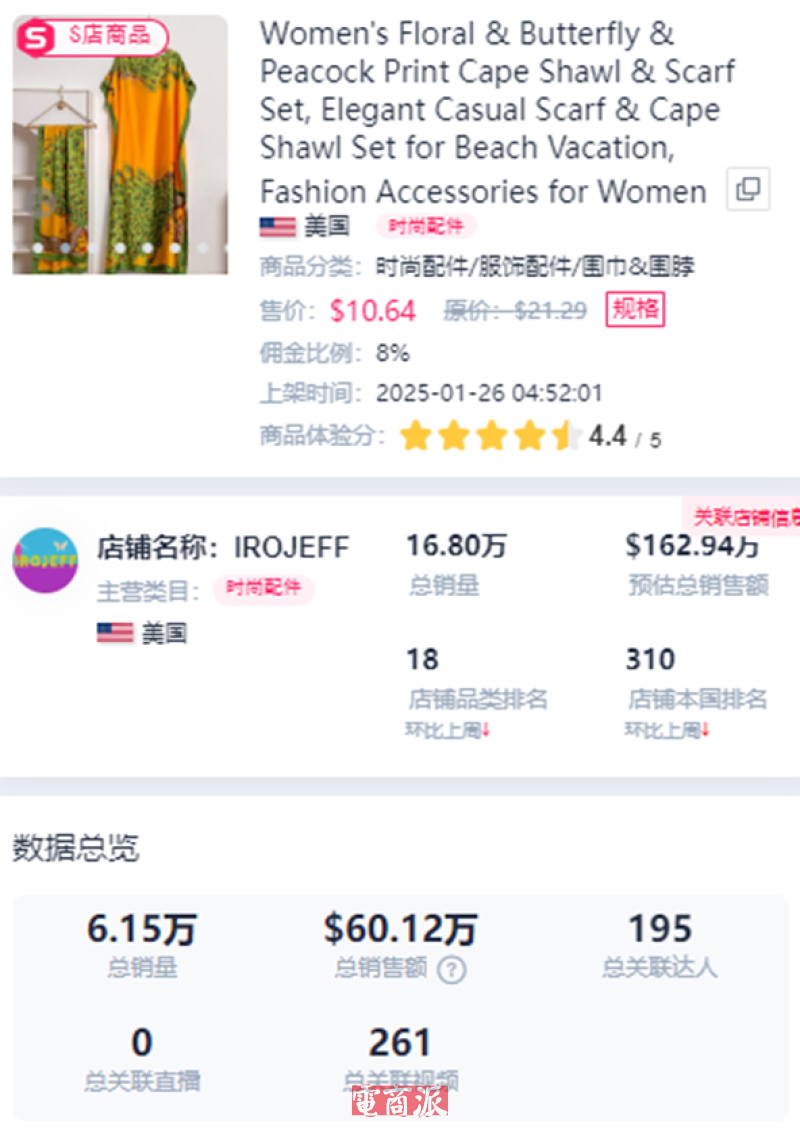 受這股時尚熱潮的推動,TikTok上多家專營kaftan長袍的店鋪迎來了大量訂單。其中,跨境店鋪IROJEFF表現(xiàn)尤為突出,其銷售的10.64美元一件的“女式花卉蝴蝶孔雀印花斗篷披肩圍巾套裝”在過去一個月內(nèi)售出3.8萬件,環(huán)比增長118.04%,月銷售額達39.03萬美元(約合人民幣284.90萬元),成功躋身TikTok時尚配件類目銷量榜第二位。