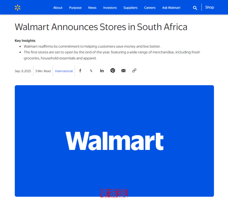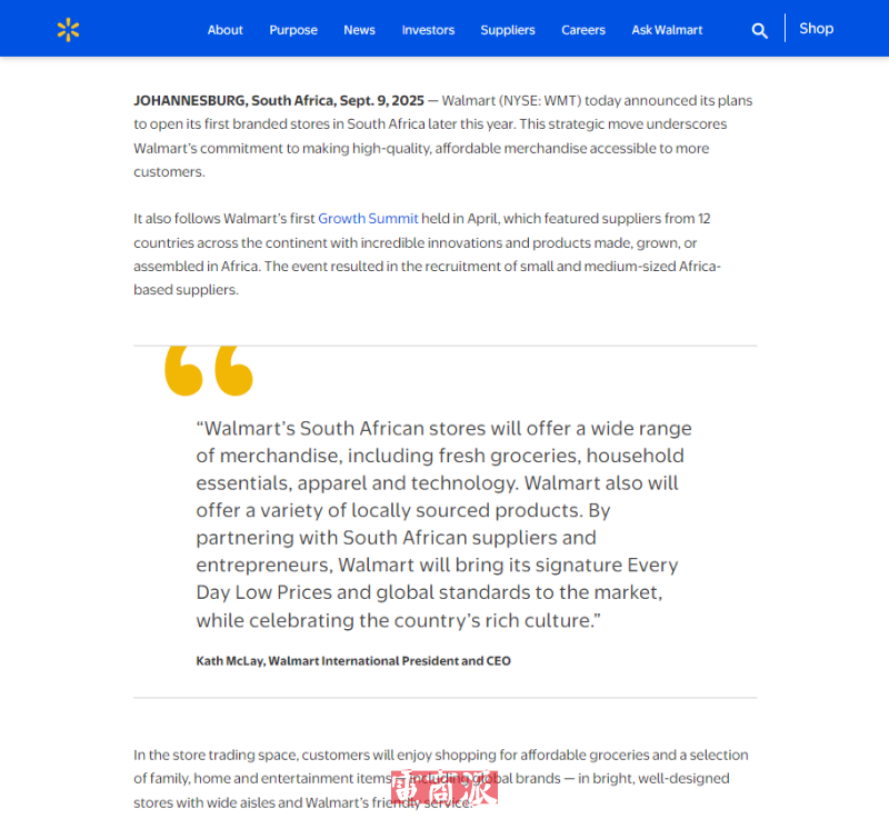 沃爾瑪進軍南非市場 年底前開設首批自有品牌門店