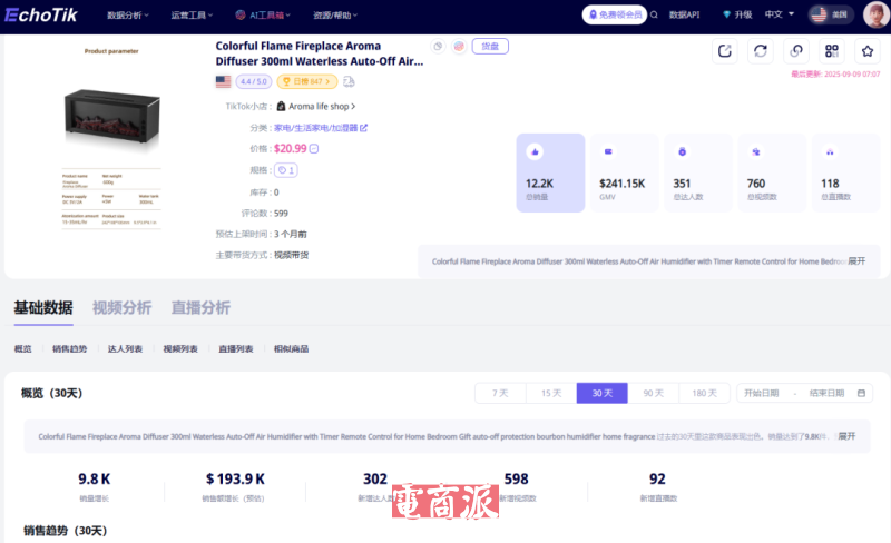 近期,在TikTok美區生活家電類目中,一款香薰加濕器火出圈了。數據顯示,該款香薰加濕器在過去一個月里賣出近萬件,總銷售額達到19.39萬美元(約合人民幣138萬元)。該香薰加濕器今年5月底正式上線TikTok美區,來自Aroma life shop店鋪,售價在20美元左右。