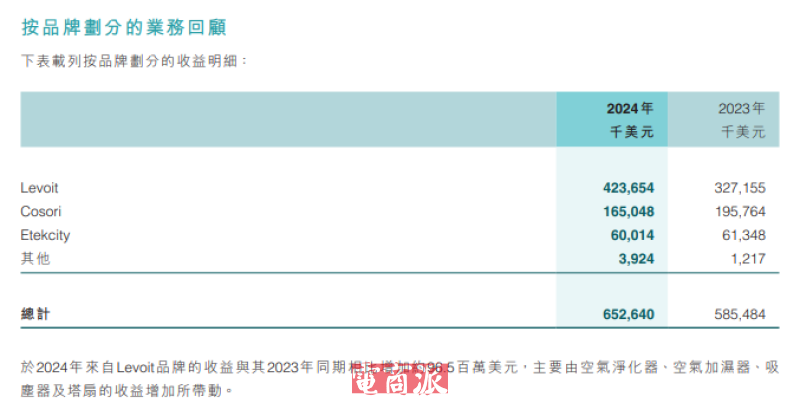 從其母公司深圳晨北科技Vesync的2024年財報來看,公司全年營收達已達到6.53億美元,其中Levoit品牌的收益突破4.23億美元,較上一年同比增長29.5%,占母公司總收益的64.9%,功不可沒。