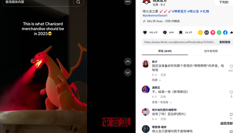例如一款寶可夢噴火龍造型加濕器,就被一個達人帶火,在短短幾秒的視頻中,達人將液體注入噴火龍的背部點亮光效,向下按壓后,噴火龍就從口中噴出水霧,十分炫酷。據了解,該視頻已獲得超600萬的播放量,近千名用戶在視頻表示了對該產品的喜愛,紛紛評論“在哪里可以買到!”