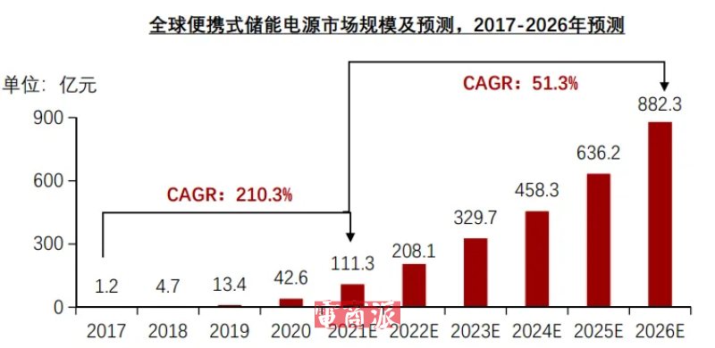 有數據資料顯示,2023年全球儲能市場規模約362.5億美元,2024年便迅速增長至627億美元,同比增幅高達73%。中國化學與物理電源行業協會也預測道,到2026年,全球便攜式儲能市場規模將達到882.3億元,要知道,在2021年這一市場規模僅為111.3億元,增長十分驚人。?