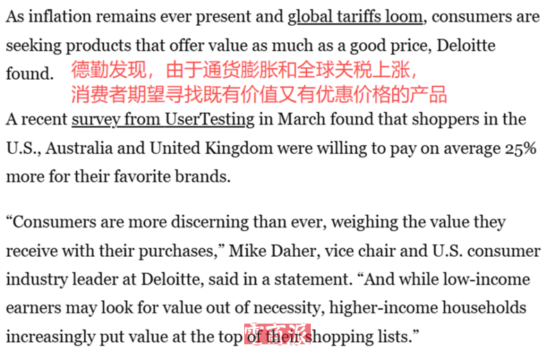 在此之前,德勤發布的一項調查則顯示,由于通貨膨脹和關稅上漲,越來越多的消費者期望尋找優惠且有價值的商品。說白了,就是消費者越來越精打細算了。