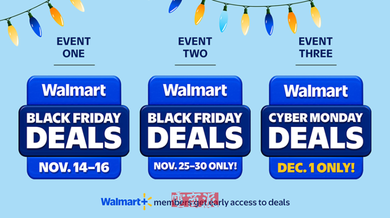 具體來看,11月14日至16日,是首場黑五促銷,線上線下同步進行。11月25日至30日,是第二場黑五活動,但27日之前僅在線上舉行,27日之后線下跟進。網一促銷則僅有一天,定在12月1日,且僅限在線購買。不過,無論哪場活動,沃爾瑪會員都有資格提前5小時參與。