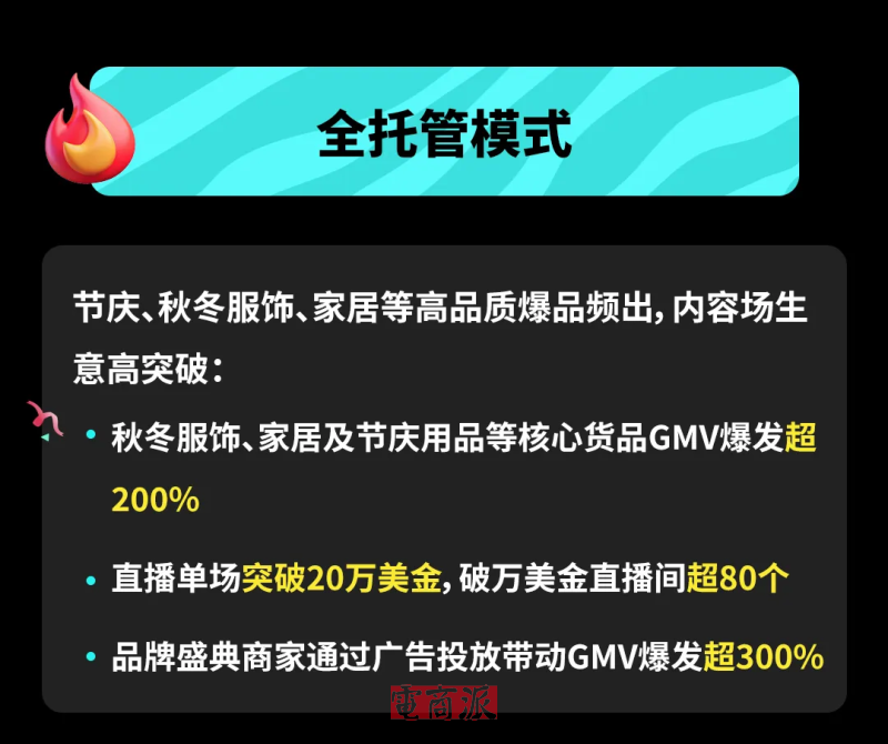 全托管模式,節(jié)慶、秋冬服飾、家居等高品質(zhì)爆品頻出,內(nèi)容場生意實現(xiàn)高突破:秋冬服飾、家居及節(jié)慶用品等核心貨品GMV爆發(fā)超200%;直播單場突破20萬美元,破萬美元直播間超80個;品牌盛典商家通過廣告投放帶動GMV爆發(fā)超300%。