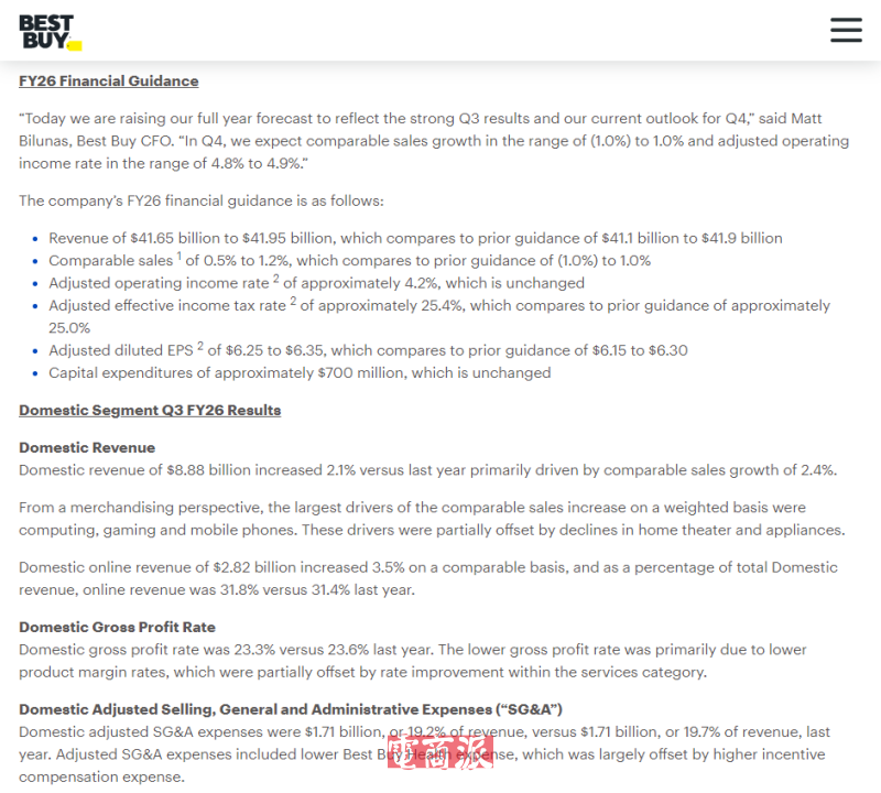 11月27日消息,百思買(Best Buy)日前發布截至2025年11月1日的2026財年第三季度財務報告。本季度,百思買銷售回暖、盈利能力穩健、線上與門店渠道同步增長,整體表現好于預期,并上調了全年盈利指引。財報顯示,三季度百思買總營收為96.72億美元,高于上年同期的94.45億美元;可比銷售增長2.7%;經營利潤率為2.0%,調整后經營利潤率為4.0%。