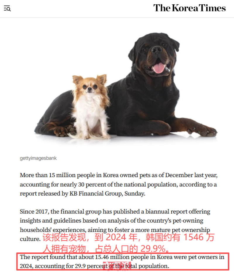 就以韓國為例,此前KB金融集團發(fā)布了《2025韓國寵物報告》,報告數(shù)據(jù)顯示,截至去年年底,韓國寵物飼養(yǎng)人數(shù)達1546萬,占總?cè)丝诘?9.9%。按照比例來算的話,意味著每10個韓國人中就有約3人養(yǎng)寵。